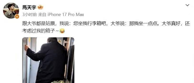 据悉,当天马天宇乘坐公共交通出行,本身持有的是站票,全程只能站立。途中遇到一位年迈的大爷,没有丝毫犹豫,便主动“让座”,可让人忍俊不禁又心生暖意的是,他让的并不是什么特殊座位,而是自己随身携带的行李箱。他小心翼翼地将行李箱放平,示意大爷坐下,那份细心与温柔,隔着屏幕都能感受到。