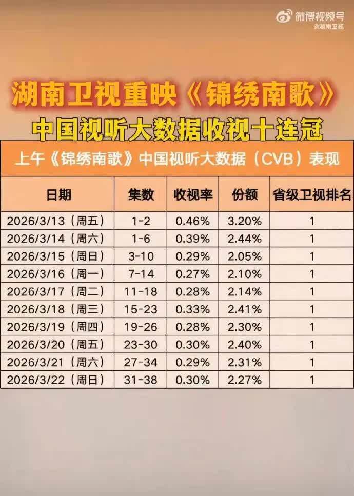 近期,古装大剧《锦绣南歌》在湖南卫视上午档重映期间。创下连续十日蝉联省级卫视收视冠军的亮眼成绩,单日最高收视率达0.46%,市场份额达3.20%,成为非黄金时段收视标杆。